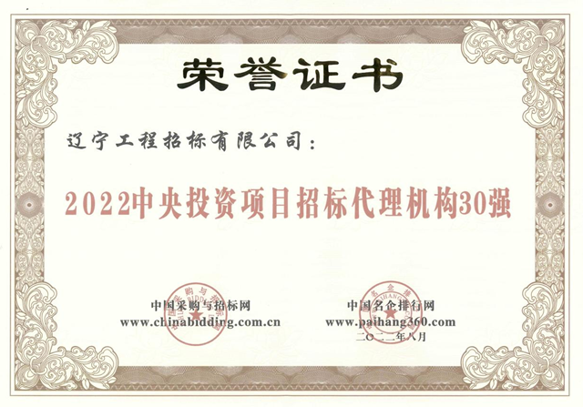 在中国采购与招标网、中国名企排行网举办的“2022 年第 16 届招投标领域年度聚焦” 评选中,我公司凭借优秀的资质条件、良好的经营业绩、健全的管理体系、诚信的服务态度获得“2022 中央投资项目招标代理机构30强”荣誉称号。