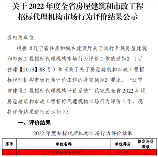 房屋建筑和市政工程招标代理机构市场行为评价是辽宁省住建厅为加强和完善辽宁地区招标代理机构市场行为监管,规范招标代理机构和从业人员执业行为,落实招标代理机构和从业人员主体责任,提高招标代理机构综合素质和业务水平而开展的年度系统工作,对提高招标代理机构综合素质和业务水平具有十分积极的作用。自2019年活动开始举办以来,公司通过不断完善内部管理制度,提升人员能力素质,规范采购业务行为,提升全过程价值服务水平,通过合规管控构建企业核心竞争力,得到行政监督、行业协会、项目单位等各方高度评价和良好的市场反馈。