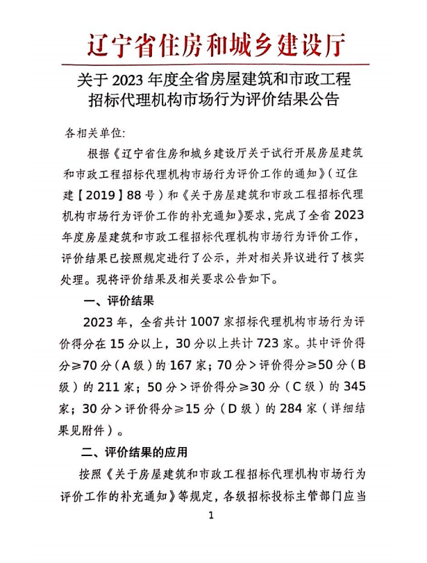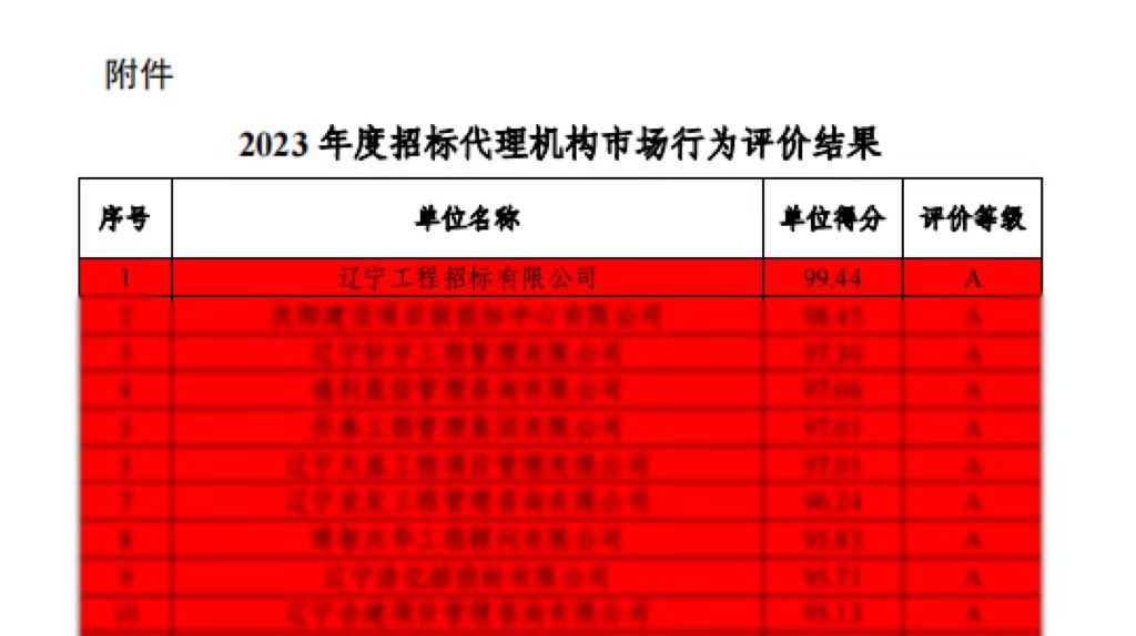 1月25日,在辽宁省住房和城乡建设厅发布的《2023年度全省房屋建筑和市政工程招标代理机构市场行为评价结果公告》中,公司以99.44分的优异成绩再次蝉联第一名,是自2019年起,连续第五年问鼎此项殊荣。