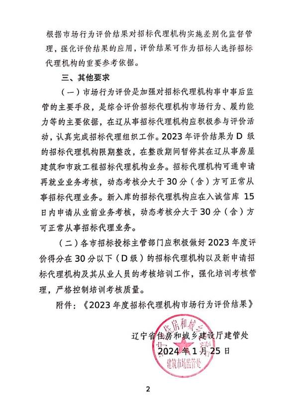 房屋建筑和市政工程招标代理机构市场行为评价是辽宁省住建厅为加强和完善辽宁地区招标代理机构市场行为监管,规范招标代理机构和从业人员执业行为,落实招标代理机构和从业人员主体责任,提高招标代理机构综合素质和业务水平而开展的年度系统工作,对提高招标代理机构综合素质和业务水平具有十分积极的作用。公司始终高度重视业务的合规化管理与市场各方的评价反馈,通过不断完善内部管理制度、建设专业人才队伍、加强风险防控能力、规范采购业务行为、提升全过程价值服务水平等一系列举措,构建企业核心竞争力,引领行业规范发展。
