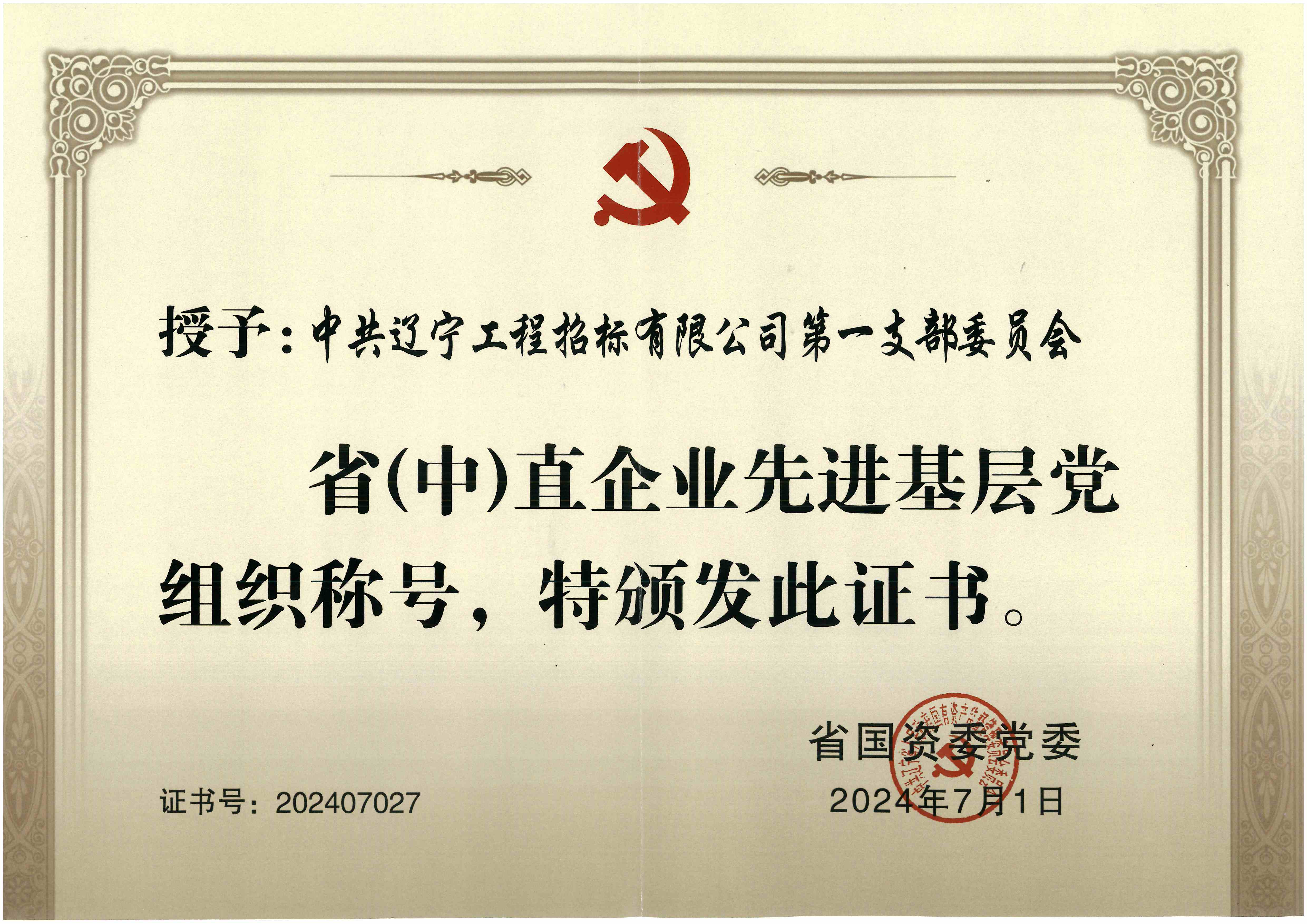 近日,我公司第一党支部被省国资委党委授予“省(中)直企业先进基层党组织”称号。